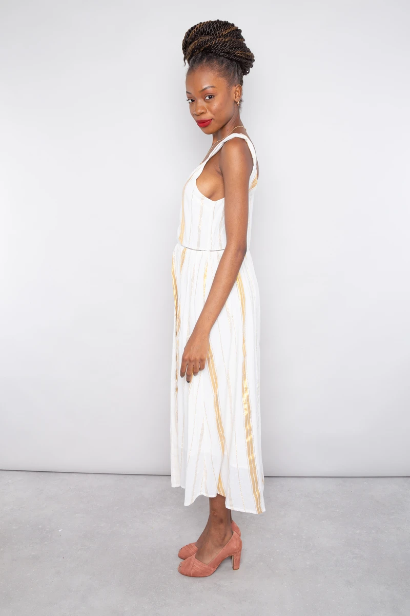 ⹠Robe longue bohÚme chic sans manches, à rayures dorées en coton