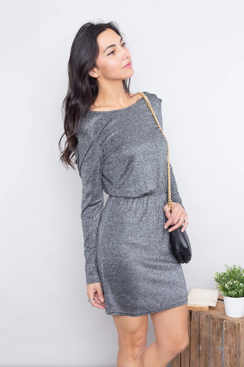 • Robe courte de soirée à paillettes argentée