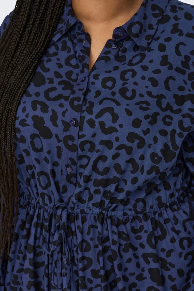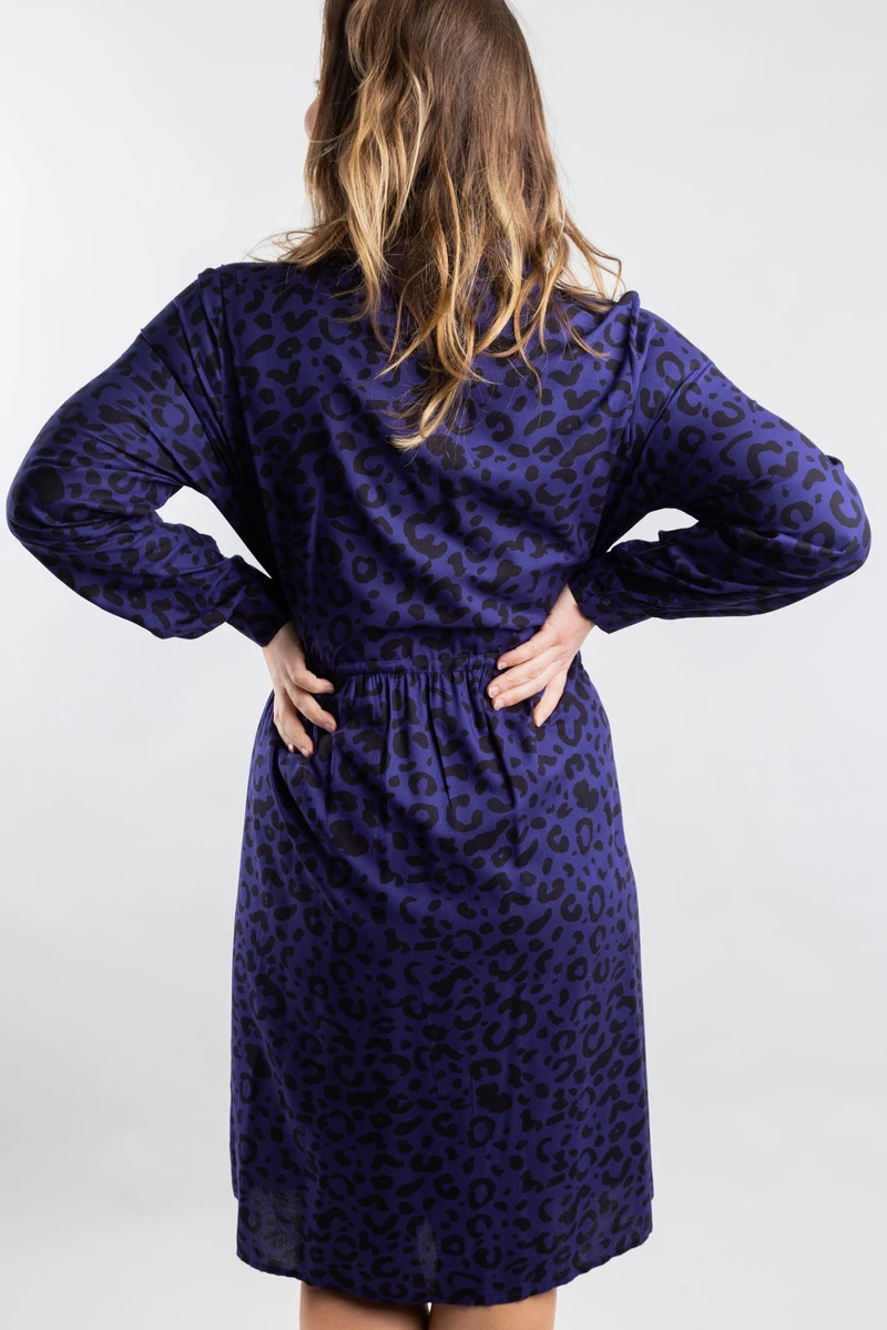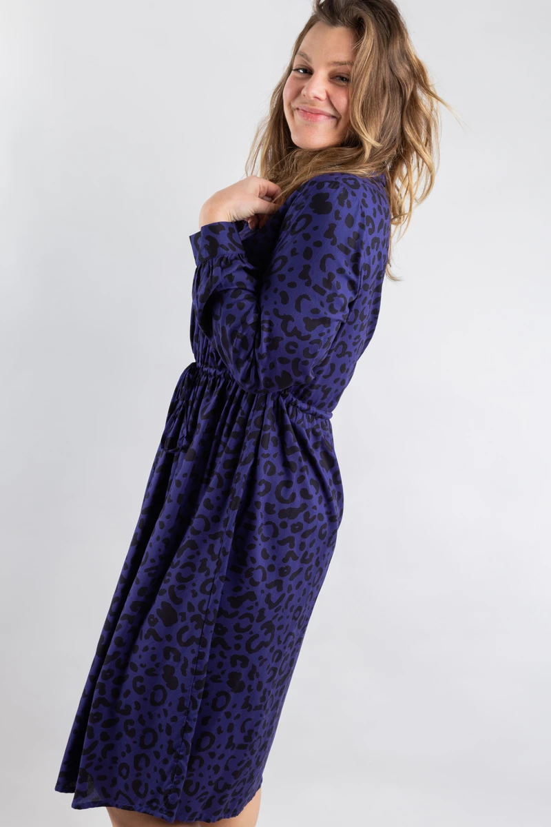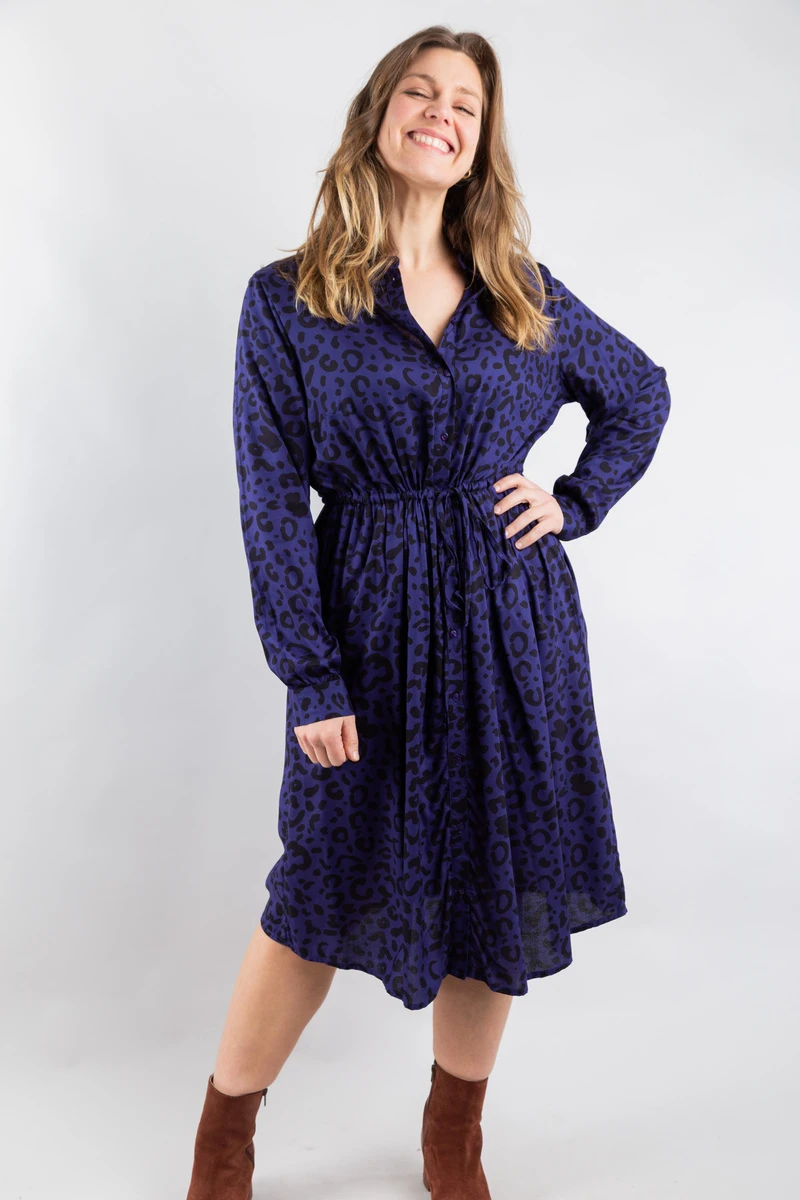 • Robe chemise bleu marine avec imprimés tâches léopards noires