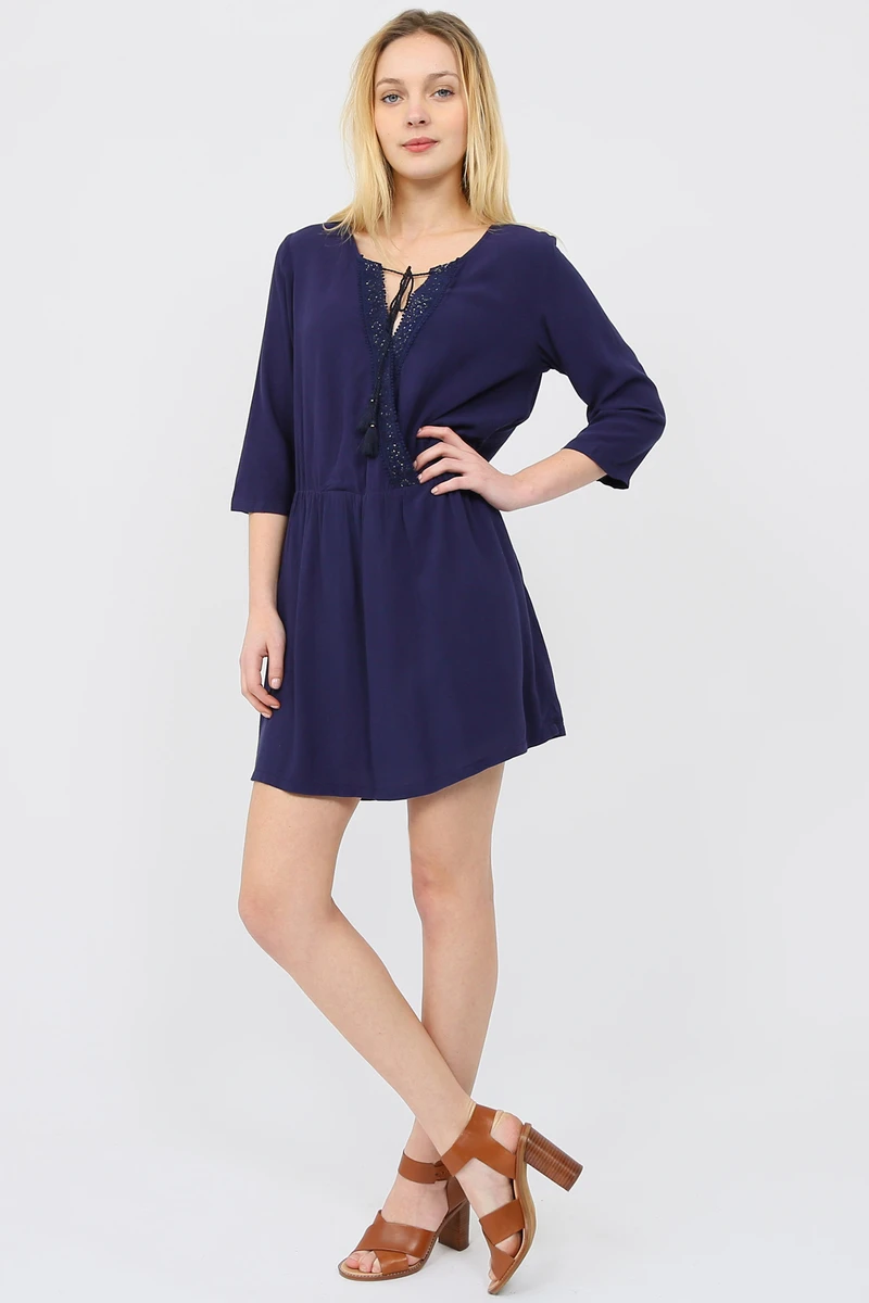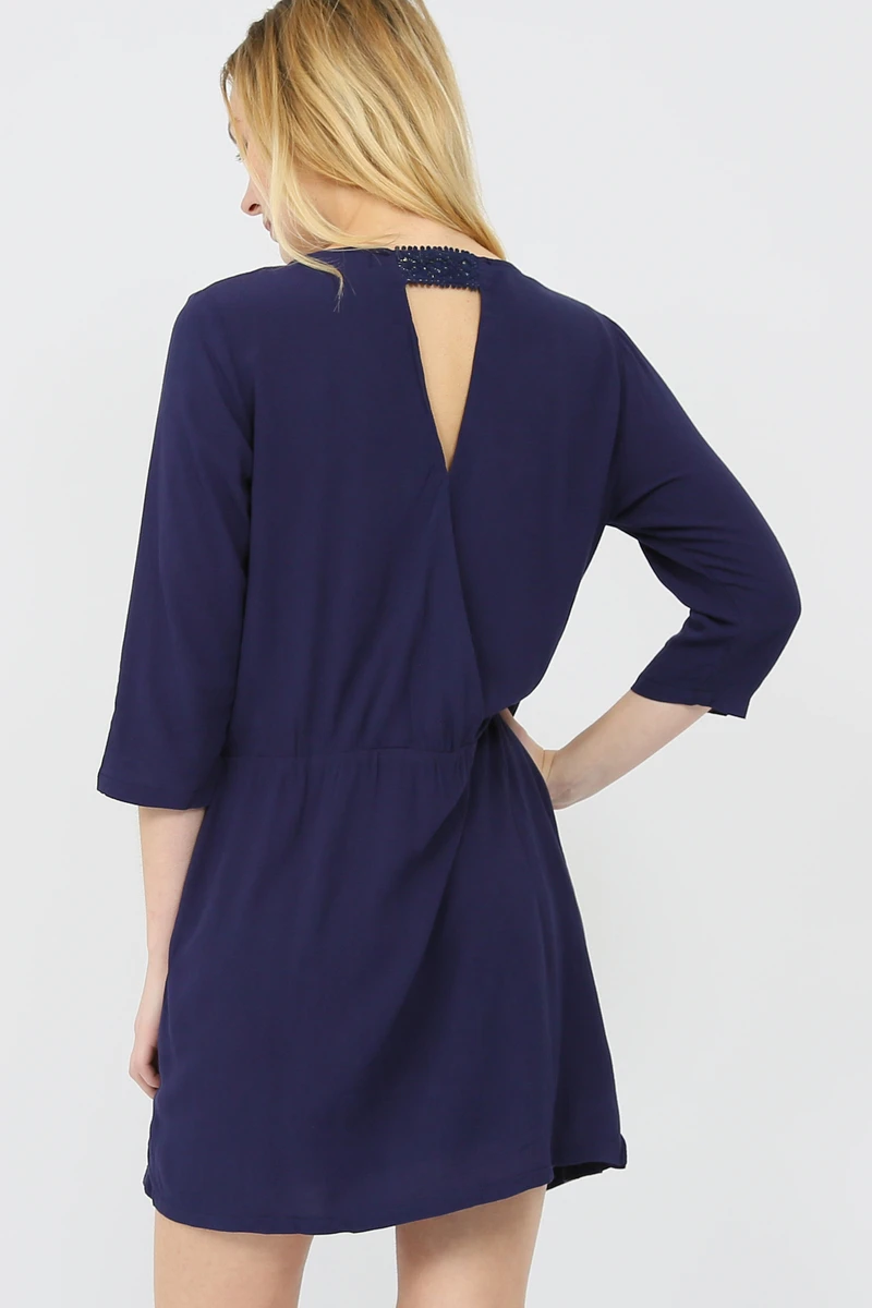 Robe bleue marine, mi longue, manches 3/4 avec couture à la taille. Ouverture triangle dans le haut du dos et col en V sur le devant resserré d’une cordelette bleue avec pompons aux extrémités. Le devant de la robe est sous forme de cache coeur (cousu à la poitrine) et les contours sont en dentelle bleue sur fond argenté.