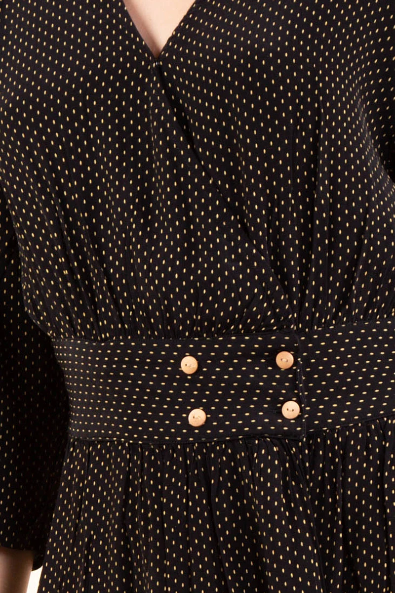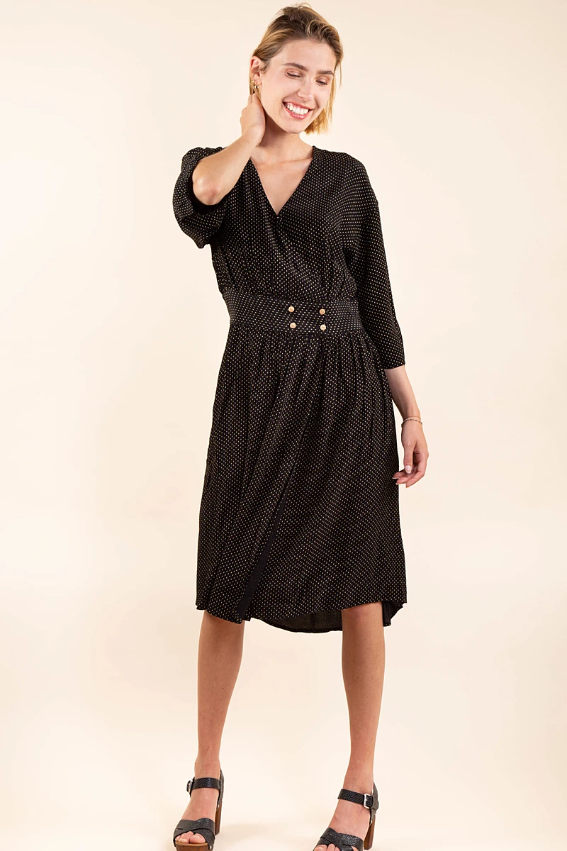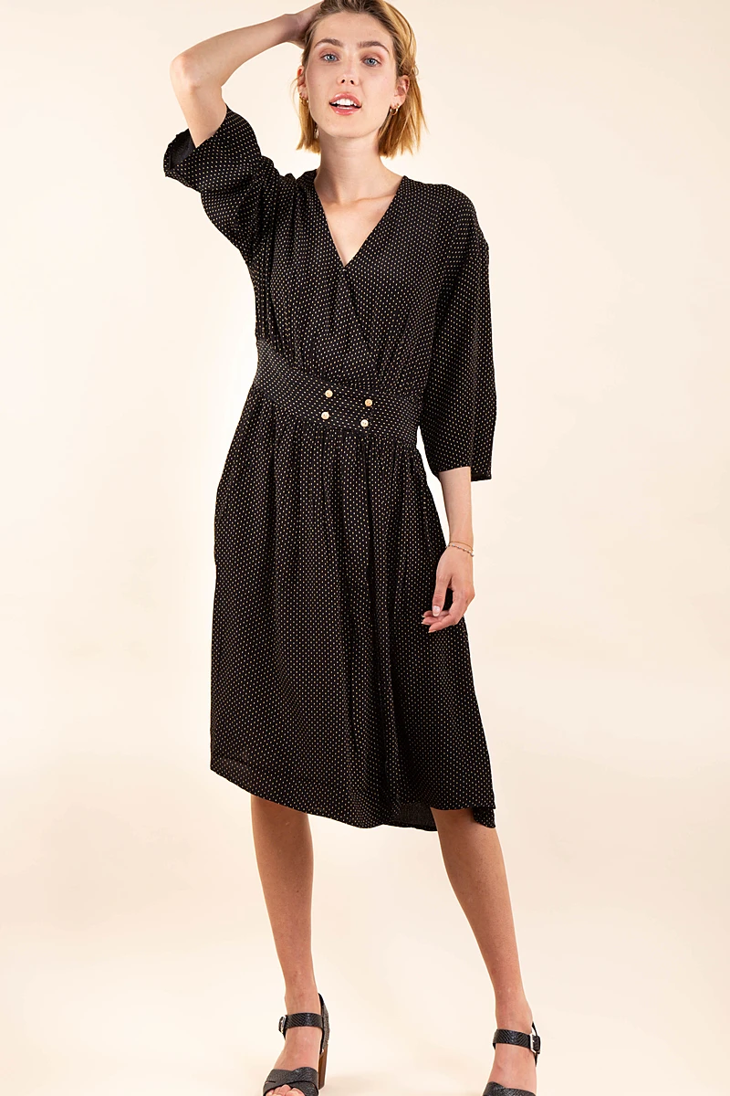 La coupe midi, le motif pois et les bouton sur l’avant de la robe sont le signe d’un look vintage.