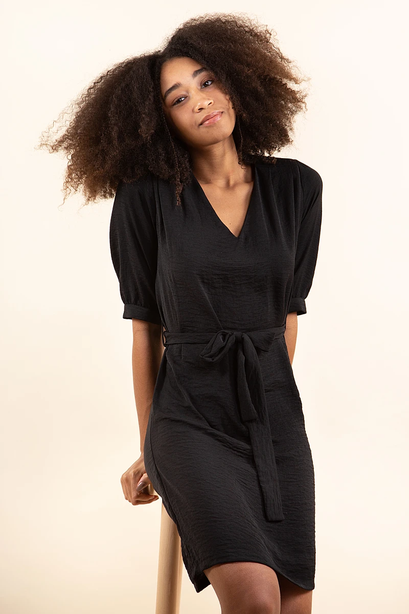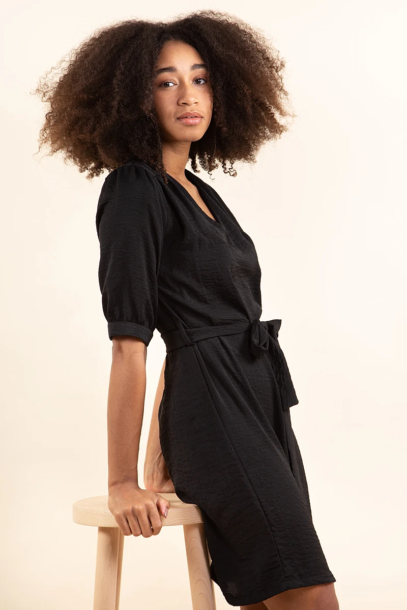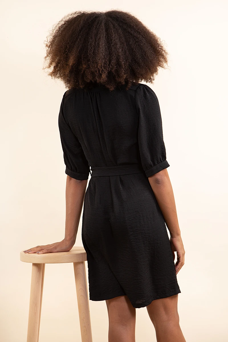 Retrouvez la robe Ange unie noire, sa coupe cintrée et le détail des épaulettes. Cassez le côté romantique de cette robe avec un perfecto en cuir !