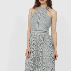 Robe en dentelle grise avec col montant, cintrée à la taille et zip dans le dos.