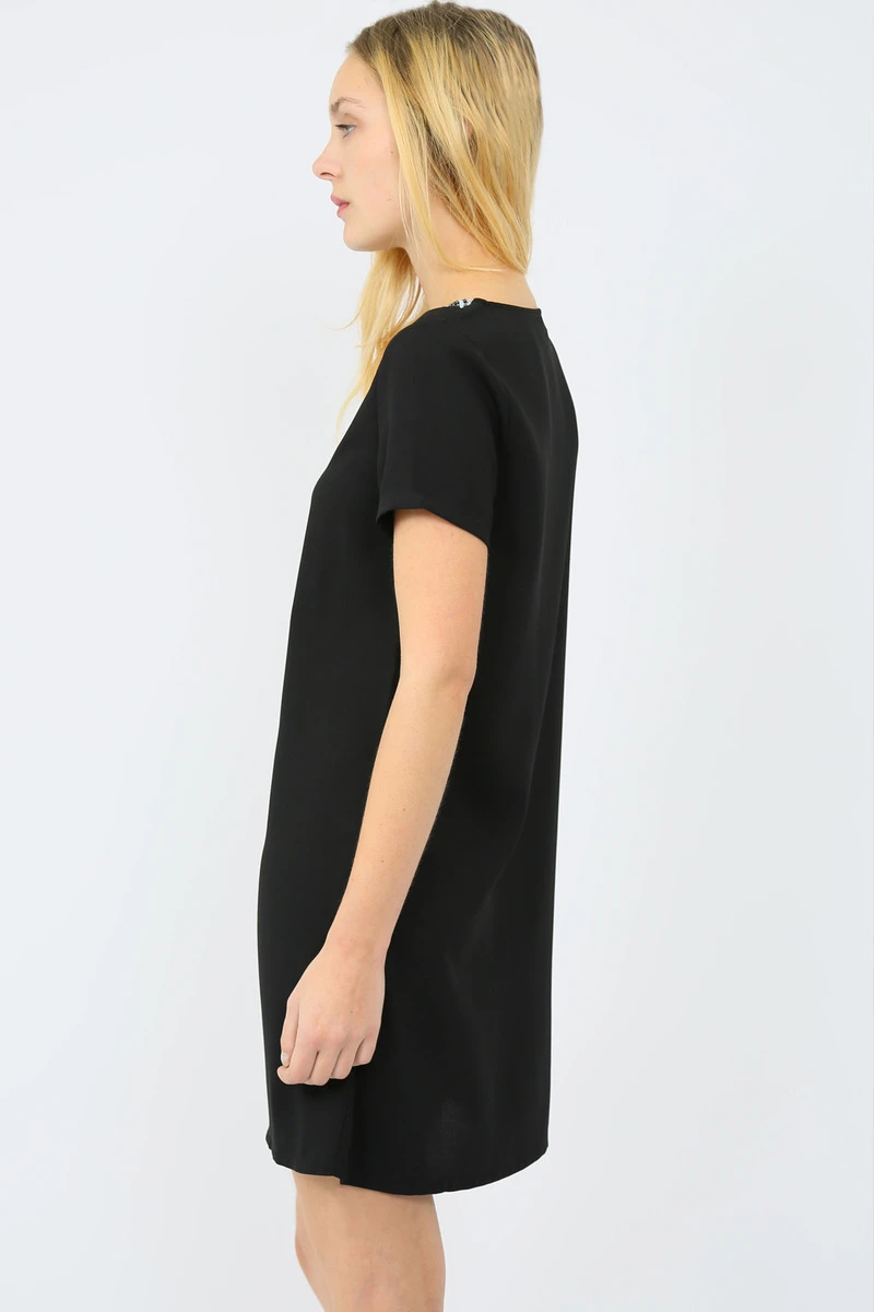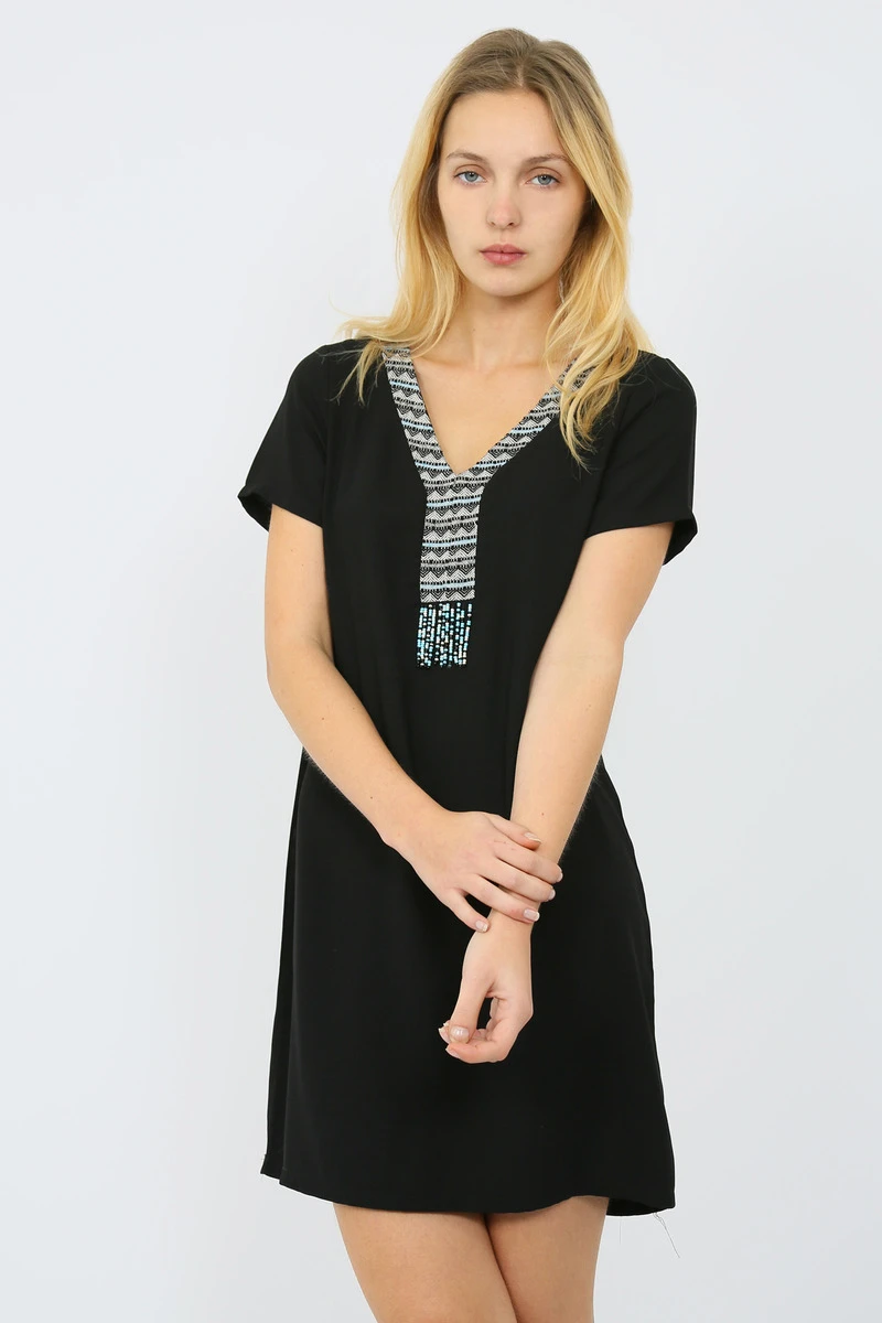 Robe noire manches courtes et col V avec détails de franges perles bleues.