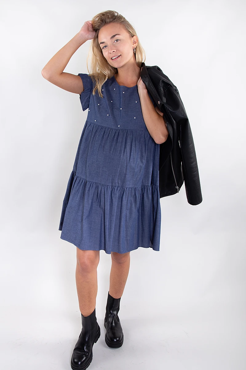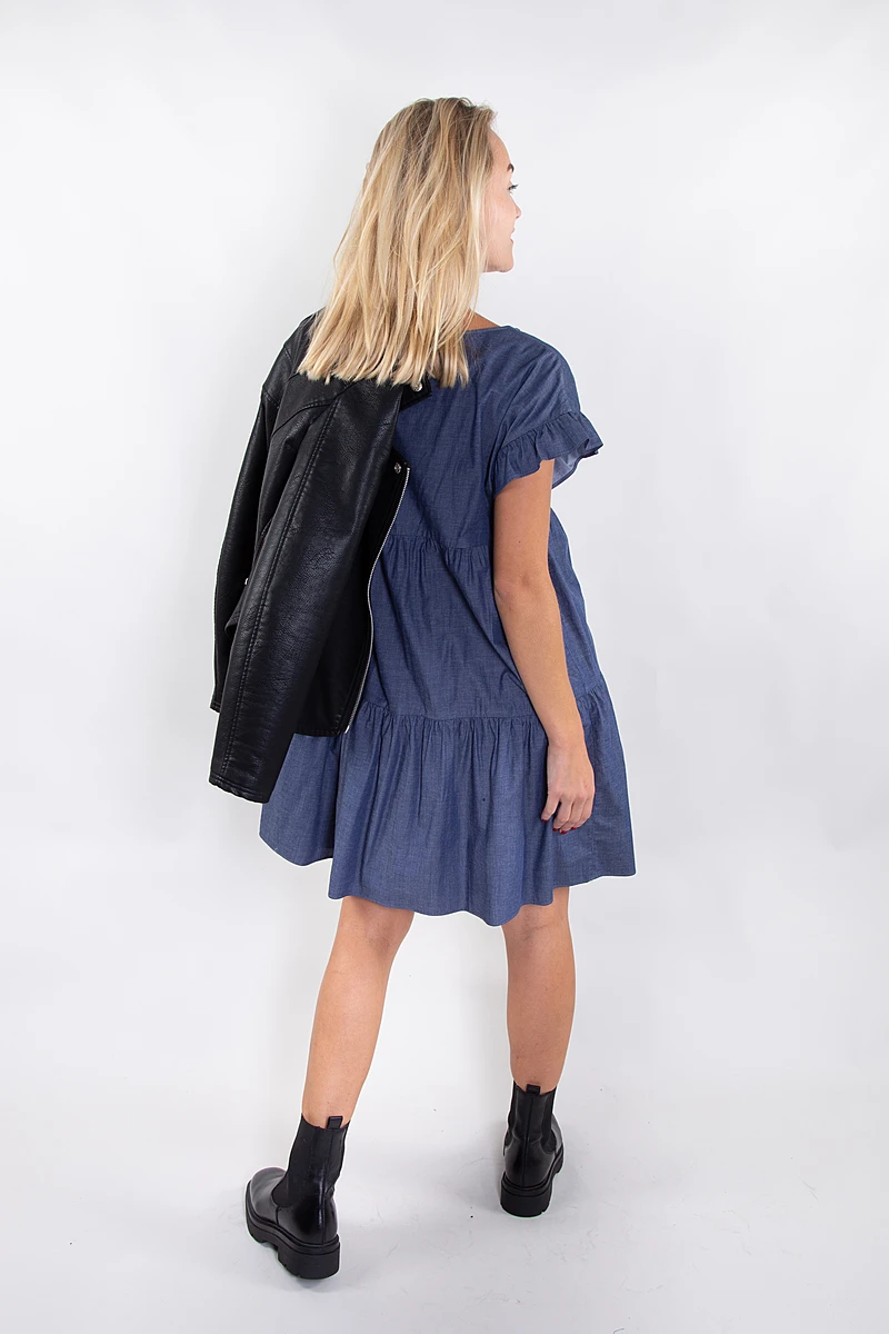 Coupée dans un tissu en coton fin couleur denim, cette robe romantique est légère parfaite pour l’été.