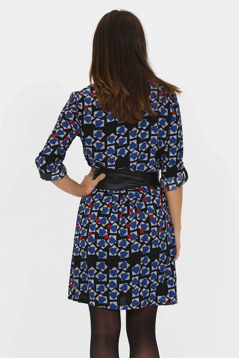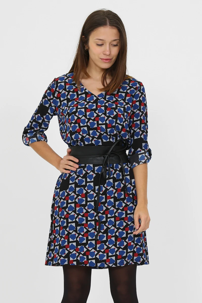 Robe graphique bleue, noire et rose, manches 3/4 et col en V. Ceinturée grâce à une ceinture bleue.