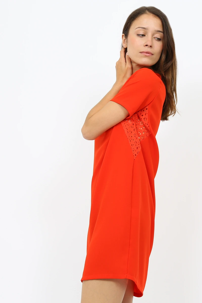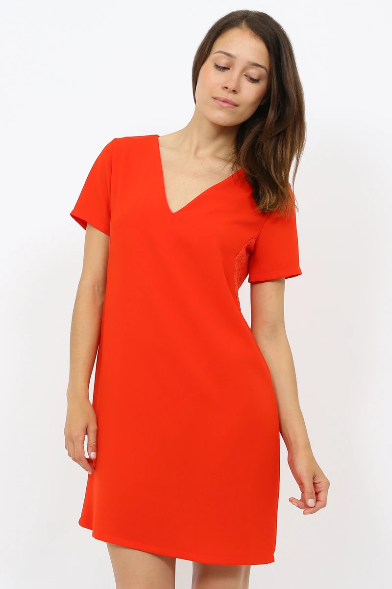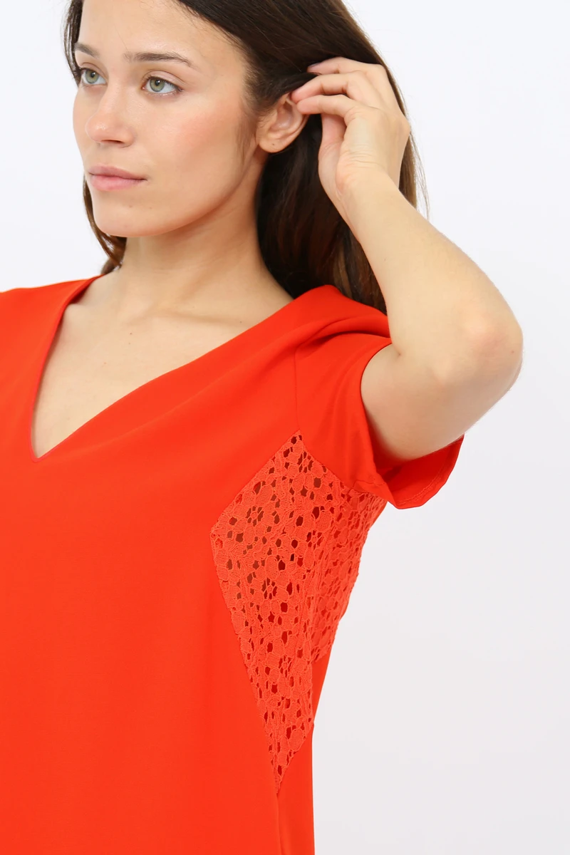 Robe rouge, manches courtes et col en V. Détail de dentelle ton sur ton sous les bras, légèrement transparent.