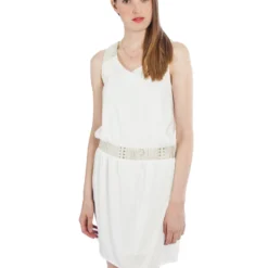 Robe blanche, manches courtes et col rond. Détail doré à la ceinture et autour du col, dos croisée.