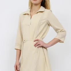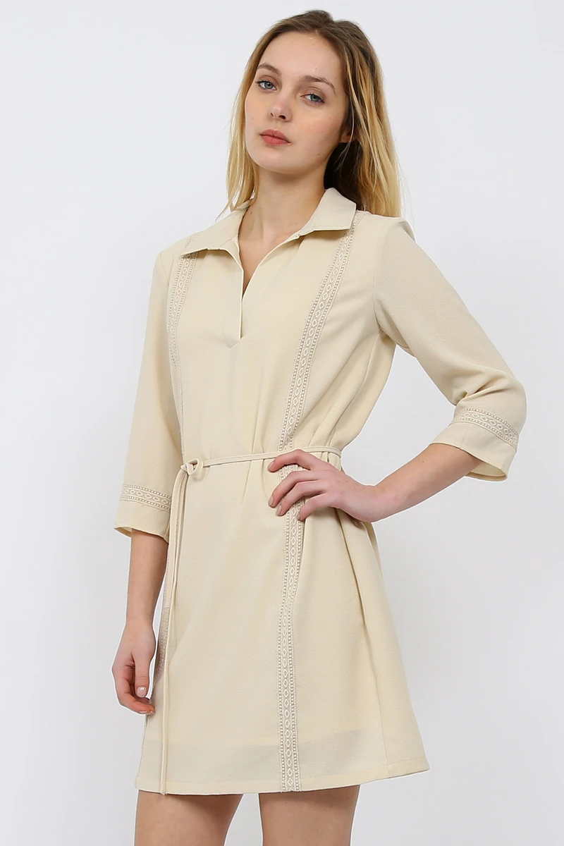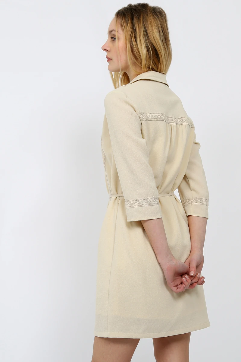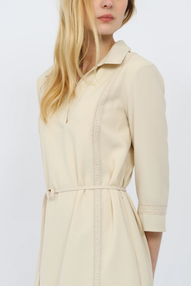 Robe beige, manches 3/4 avec col et ouverture en V. Ceinturée à la taille et détail de broderie en ton sur ton sur l’extrémité des manches, dans le haut du dos et de part et d’autre sur l’avant de la robe.