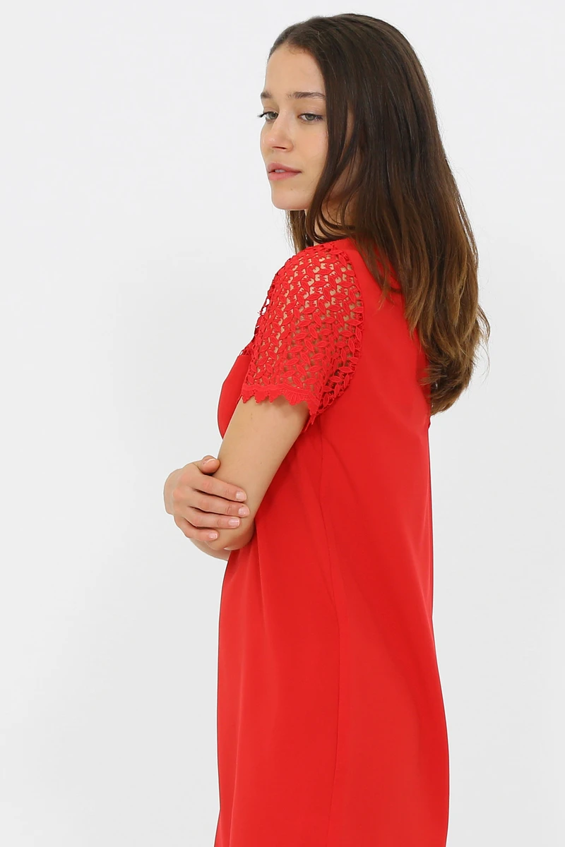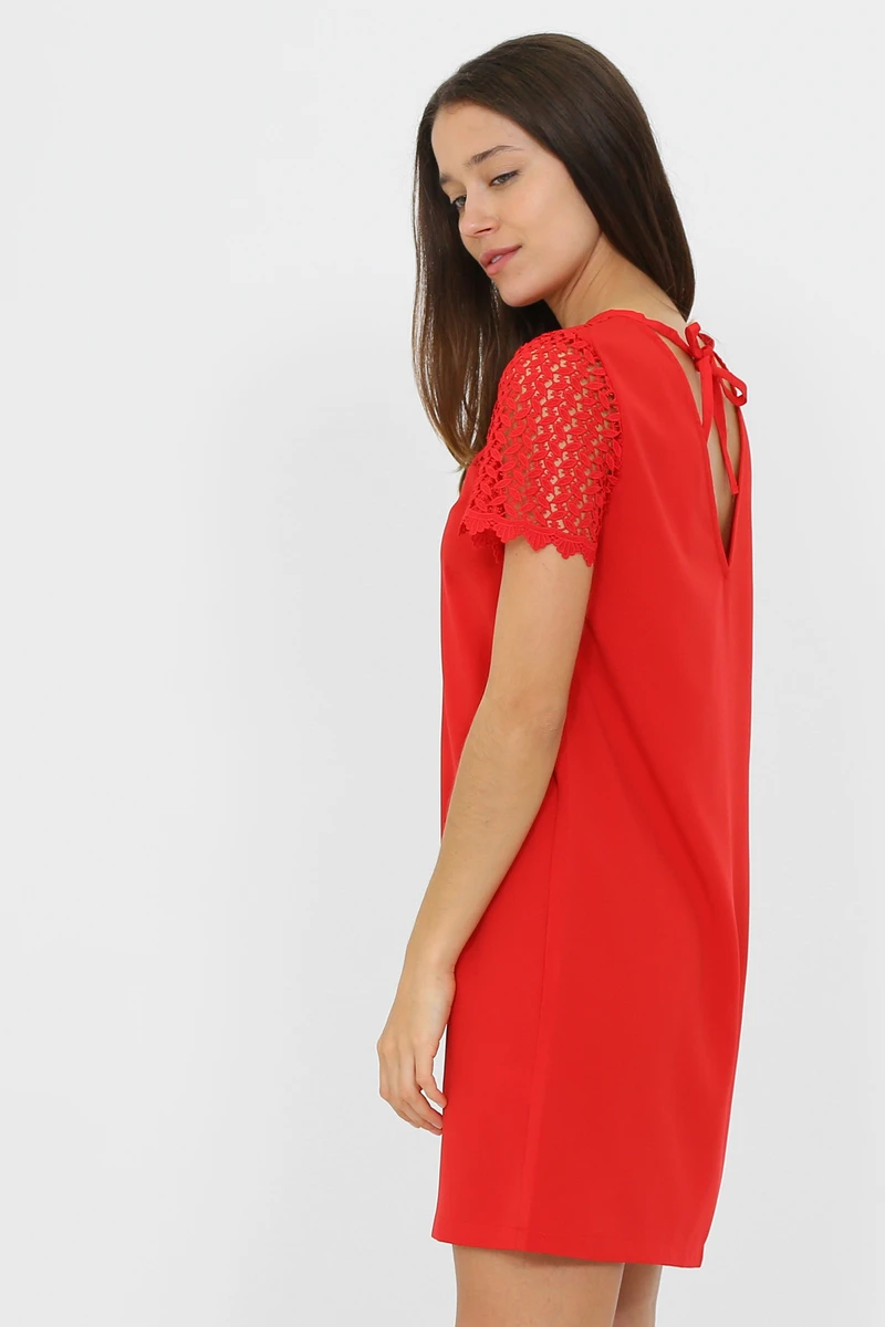 Robe rouge, manches courtes et col rond avec dentelle sur le contour du col, nouée dans le haut du dos.