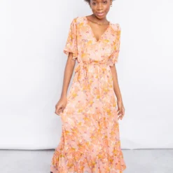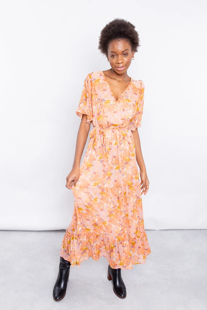 • Robe longue en mousseline à l’imprimé exclusif fleuri orange