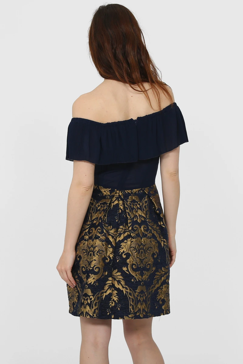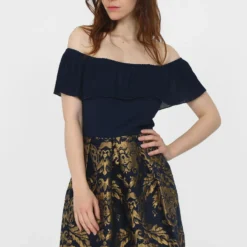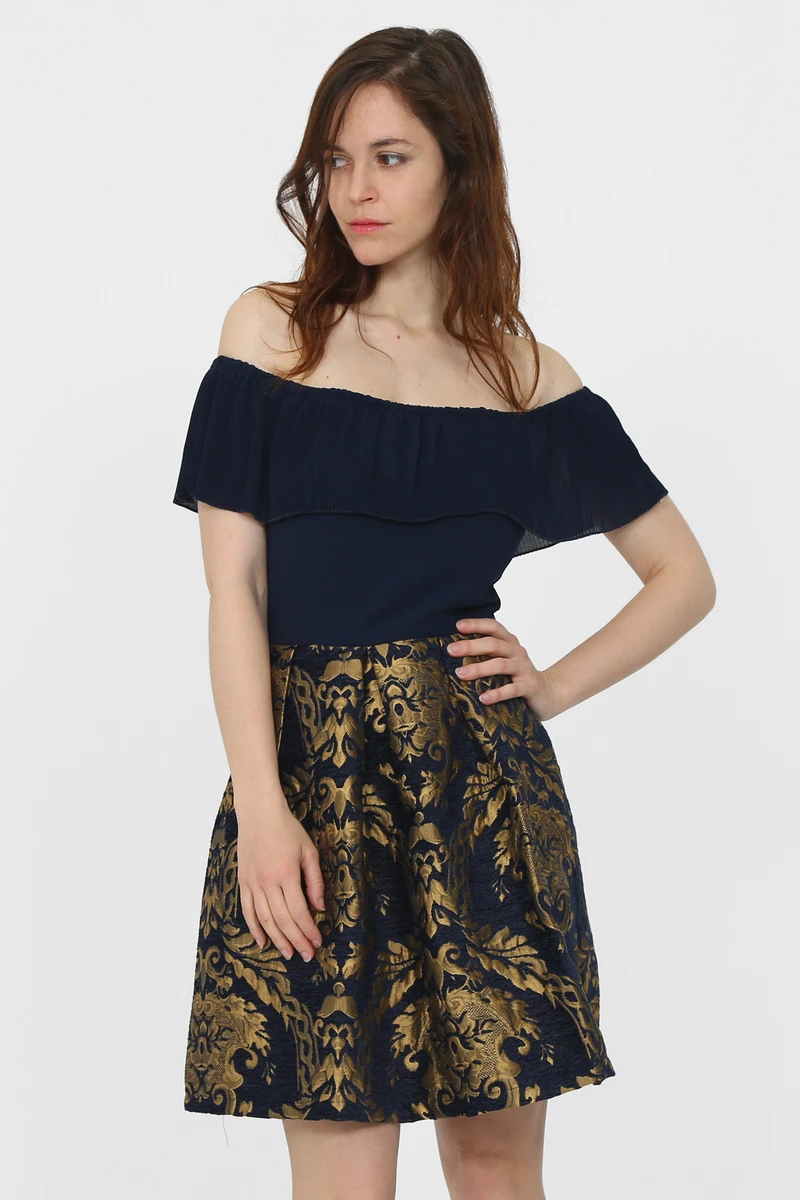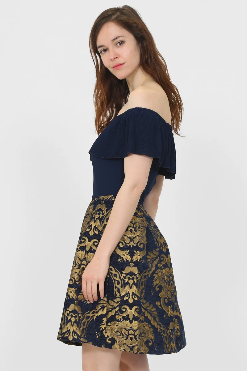 Robe bleu marine évasée avec col bateau et broderies or inspiration baroque.