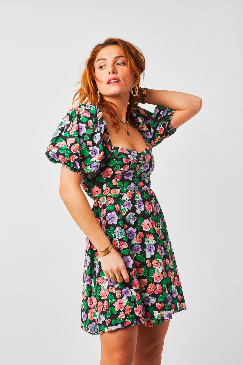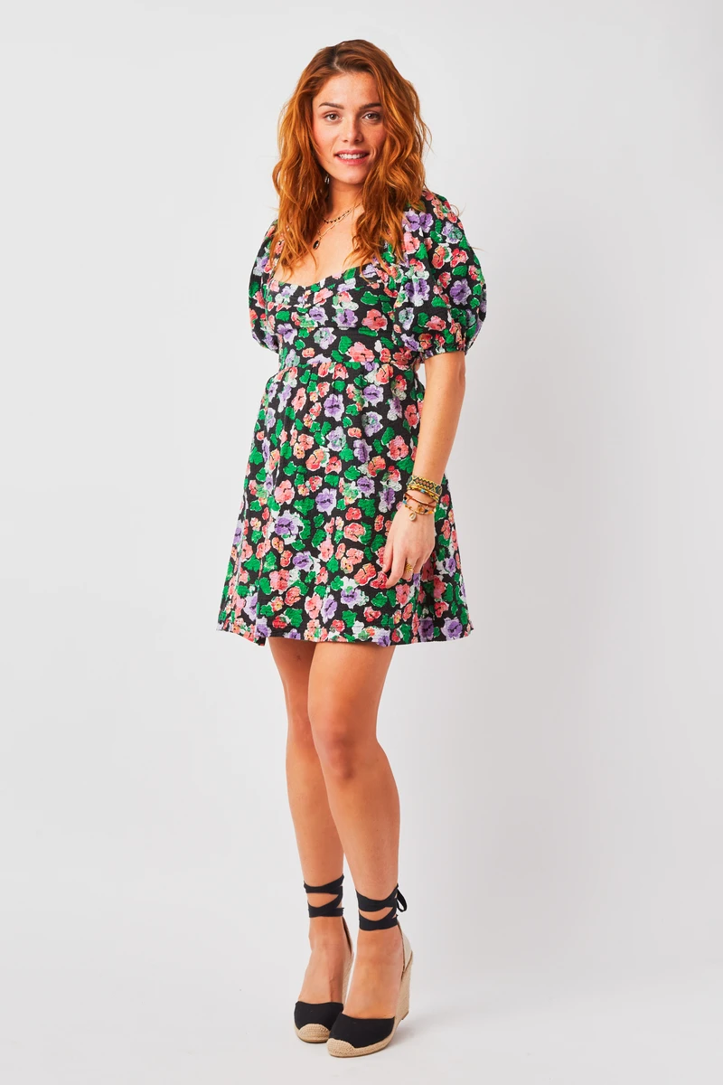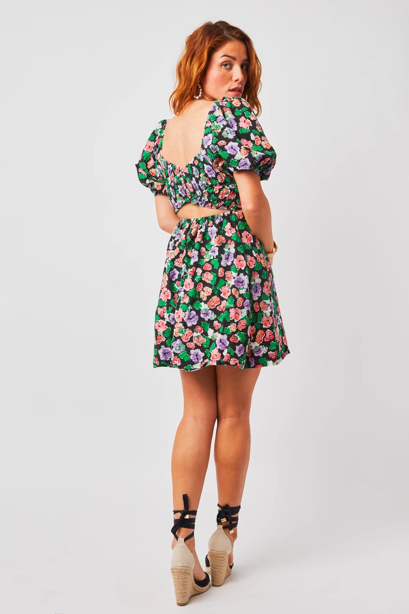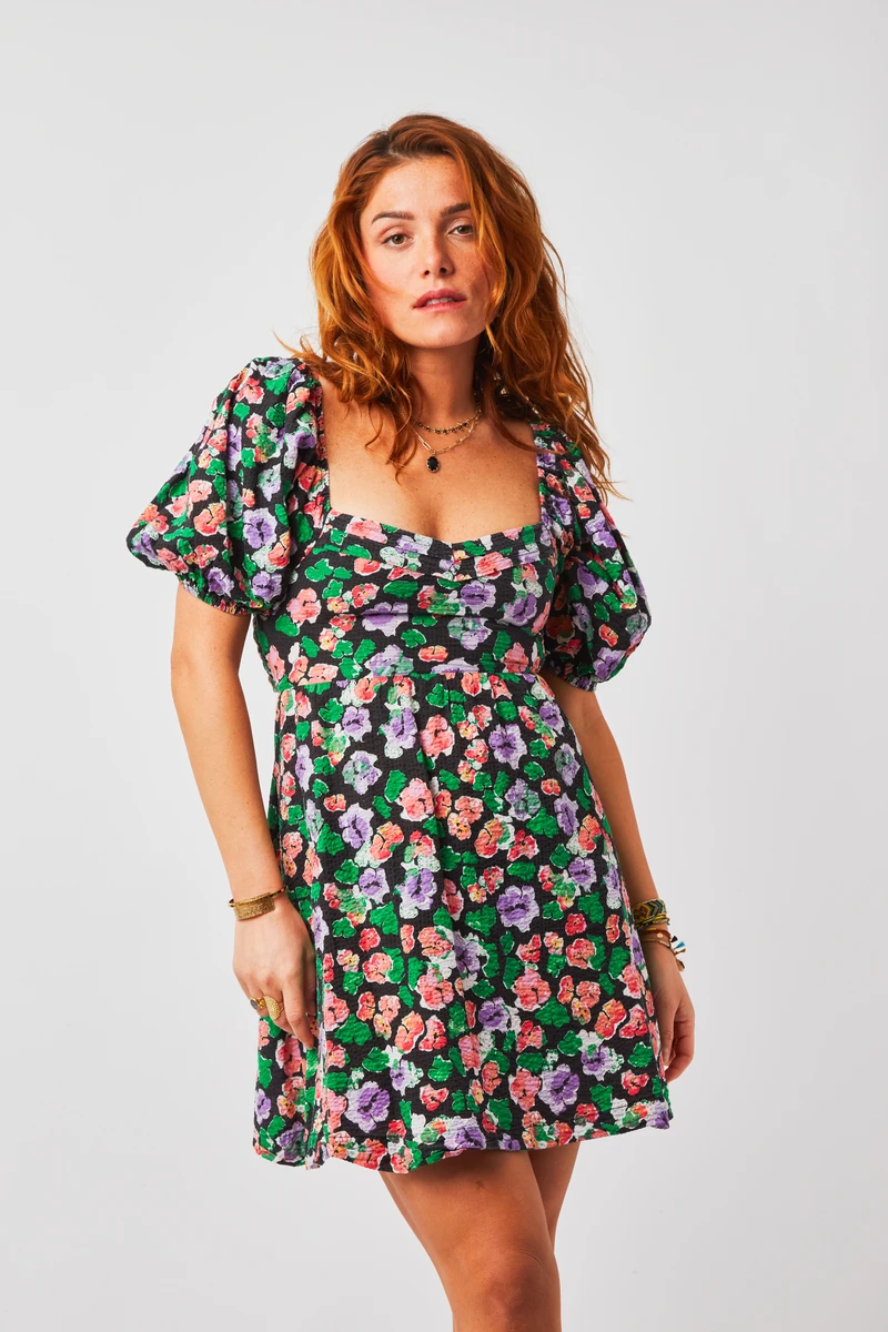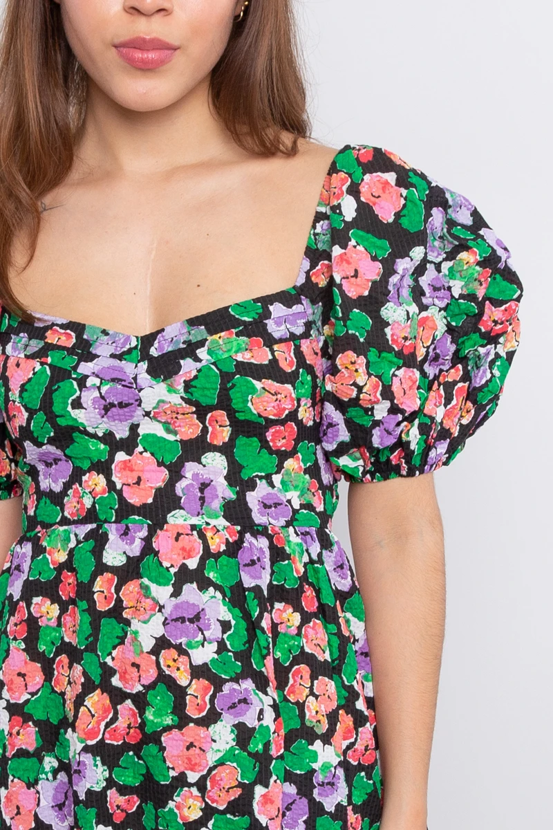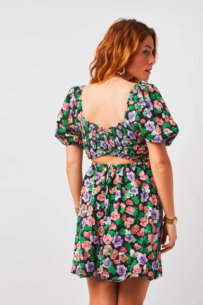 • Robe courte en seersucker imprimée fleurie rose sur fond noir