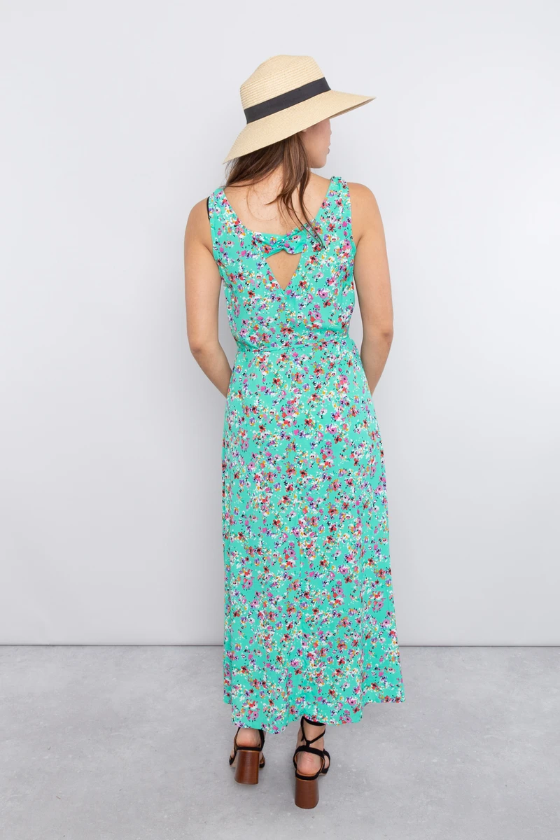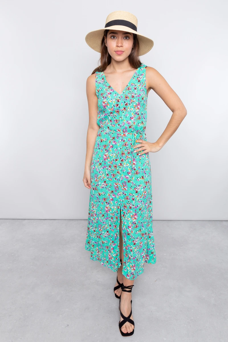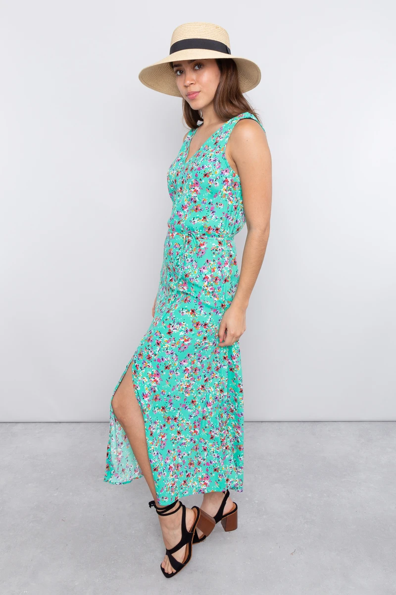 ⹠Robe longue droite, imprimé fleurie sur fond vert, fendue sur le devant