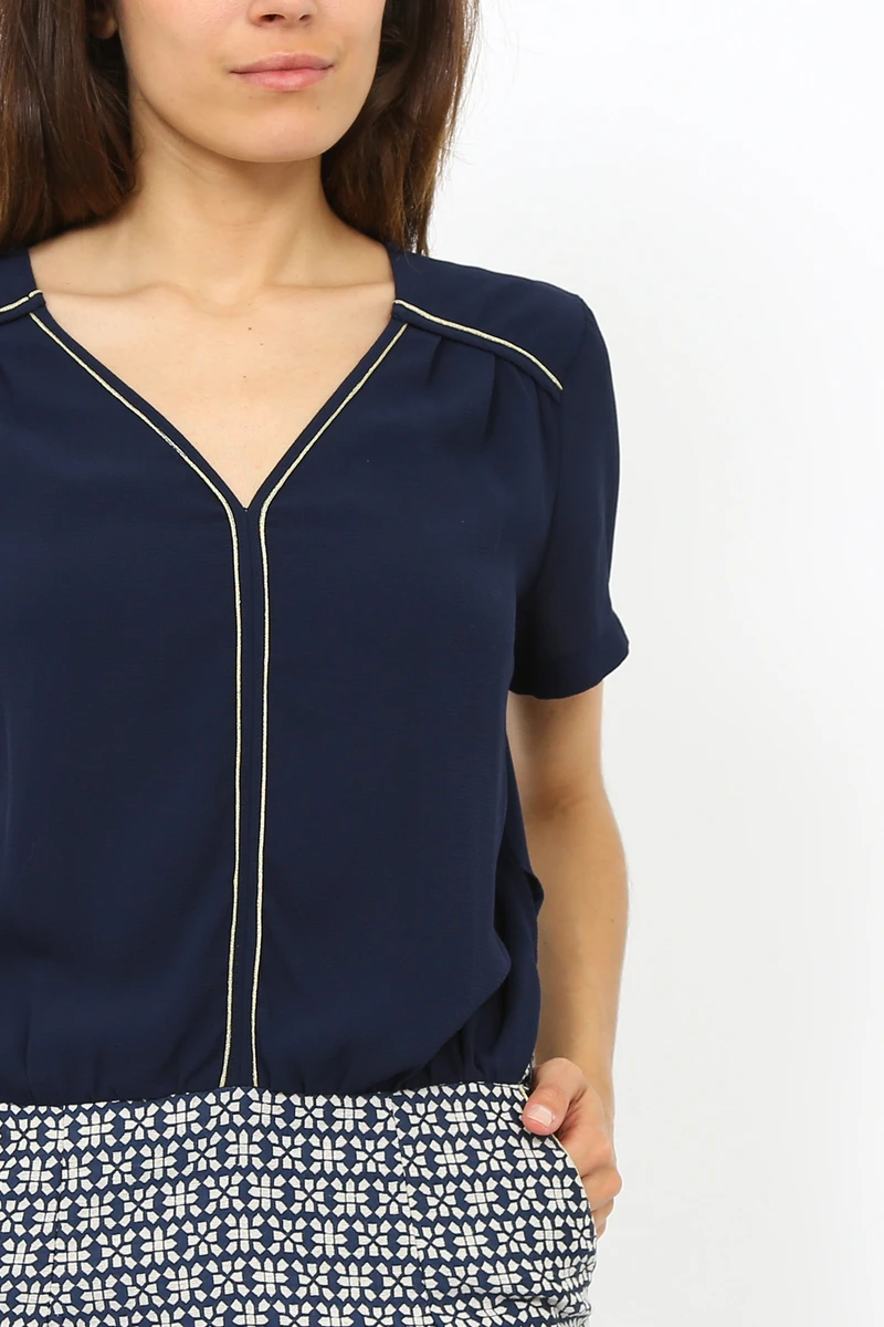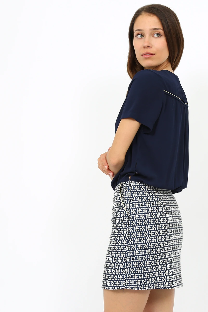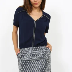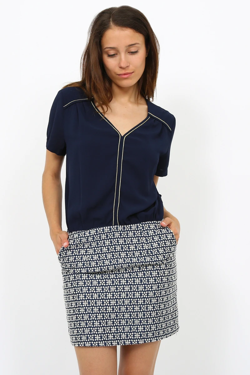 Robe bleue marine, manches courtes et col en V. Jupe avec imprimé aztÚque bleu et blanc et détail de broderie or sur le top.