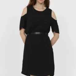 Robe noire avec col rond et manches courtes avec ouvertures.