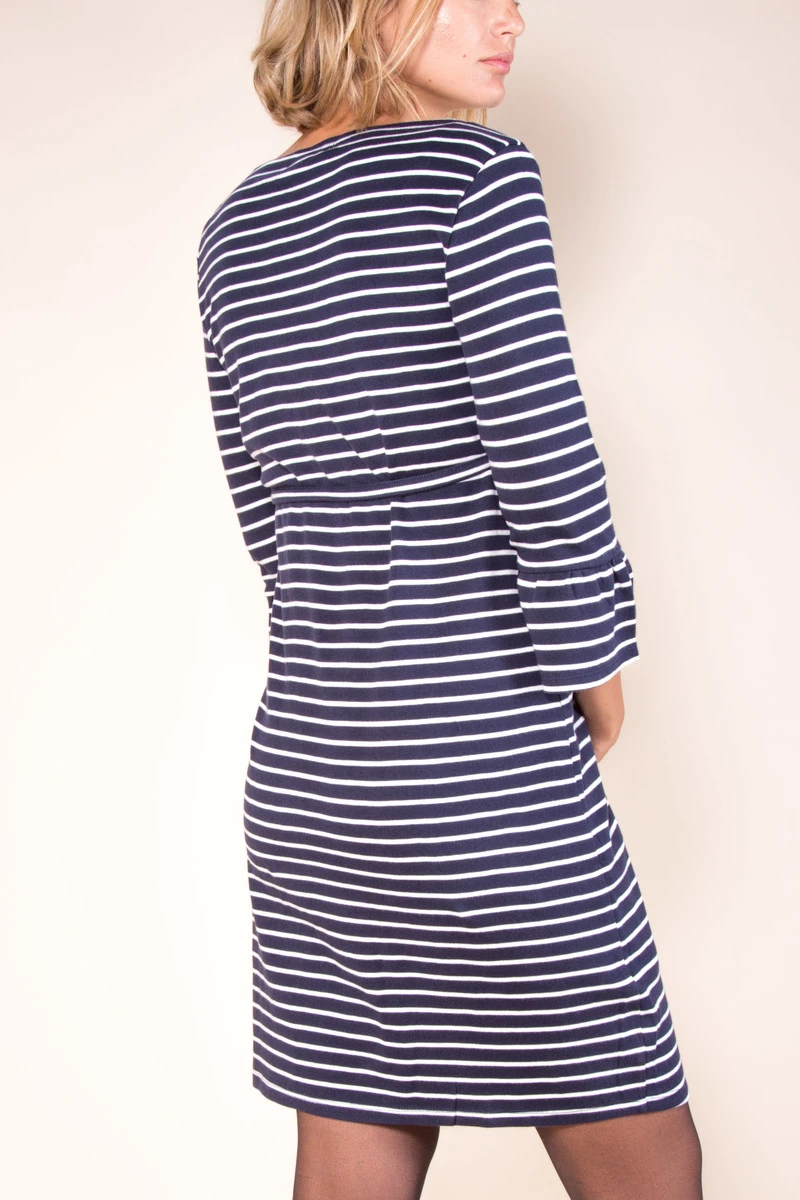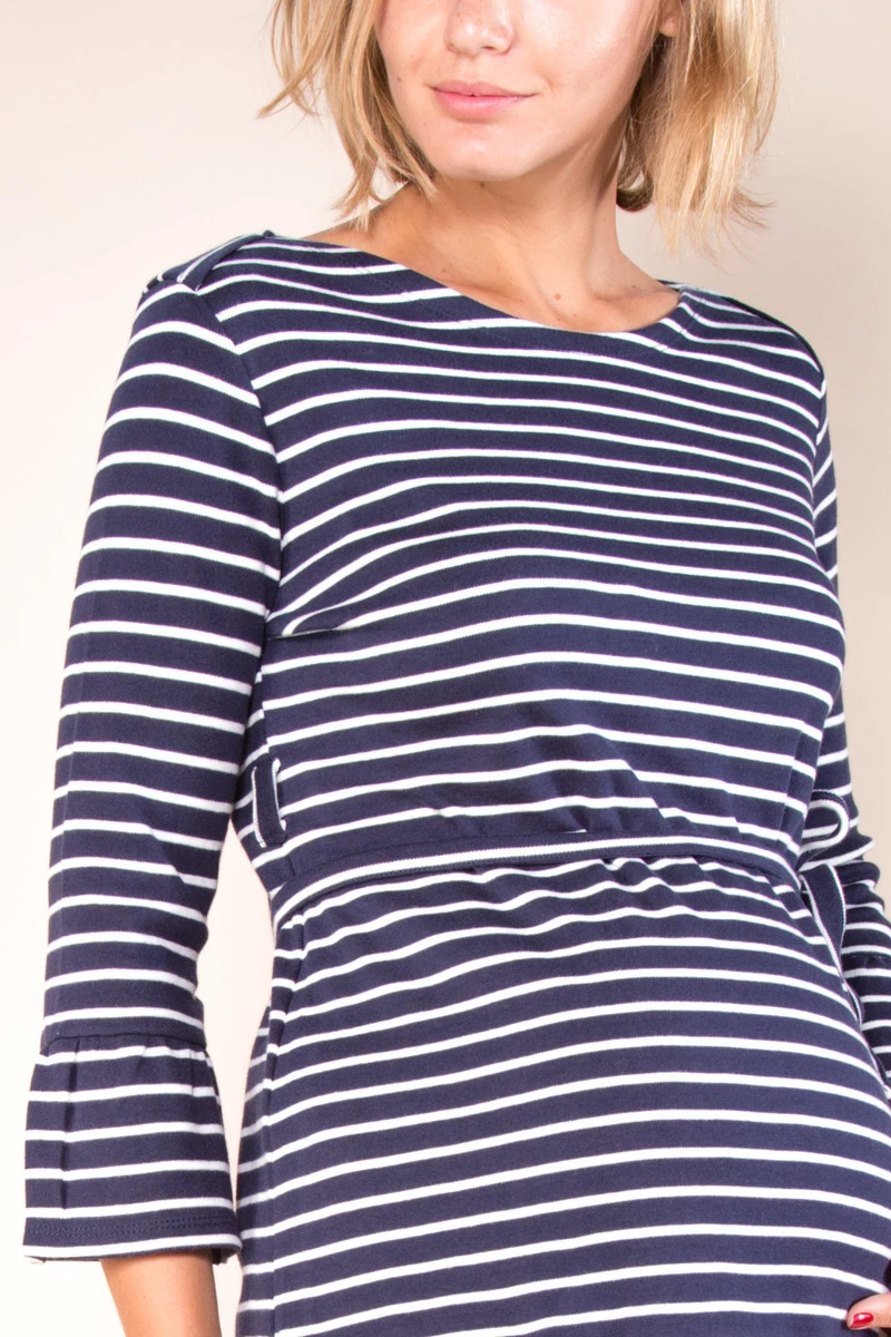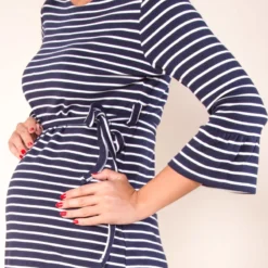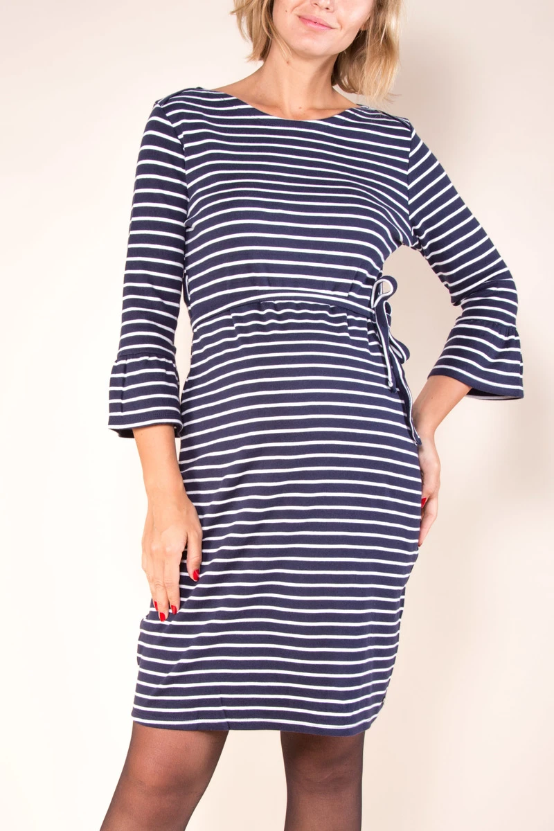 Ătre Ă©lĂ©gante, intemporelle et entiĂšrement branchĂ©e en mĂȘme temps. Câest possible avec cette robe de grossesse dâEsprit. Le vĂȘtement est rĂ©alisĂ© en coton biologique, ce qui en fait un choix durable. La robe est bien extensible lorsque votre corps commence Ă changer. La ceinture placĂ©e au-dessus de votre ventre grossissant, peut facilement ĂȘtre ajustĂ©e. Cette robe est rĂ©alisĂ©e en un motif Ă©lĂ©gant de rayures, elle est mi-longue et elle a un col bateau. Les manches volantĂ©es en font une robe entiĂšrement branchĂ©. Lorsque vous achetez ce modĂšle vous pouvez choisir votre taille ordinaire. Les tailles sont conçues de telle maniĂšre que vous pouvez acheter votre taille ordinaire.