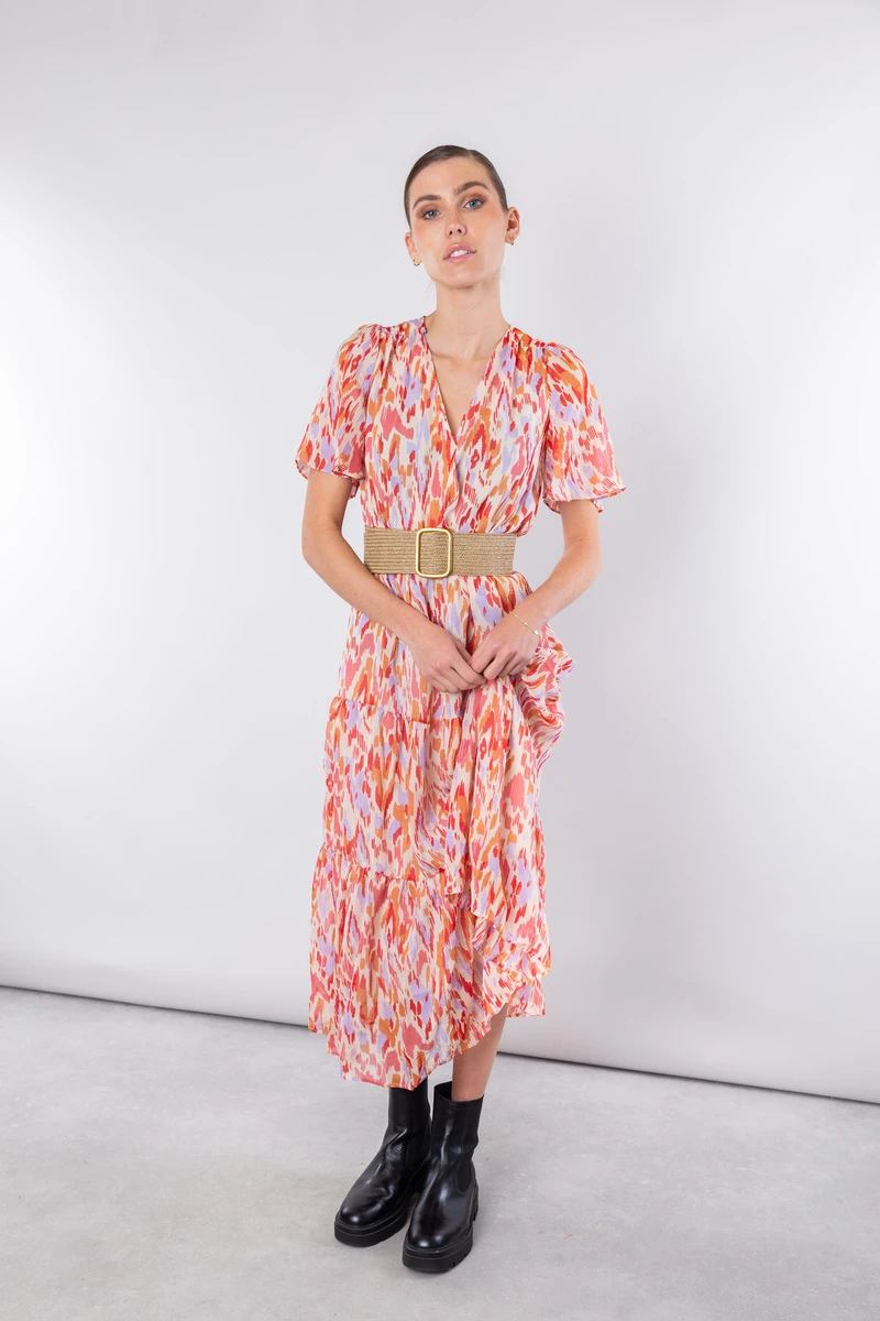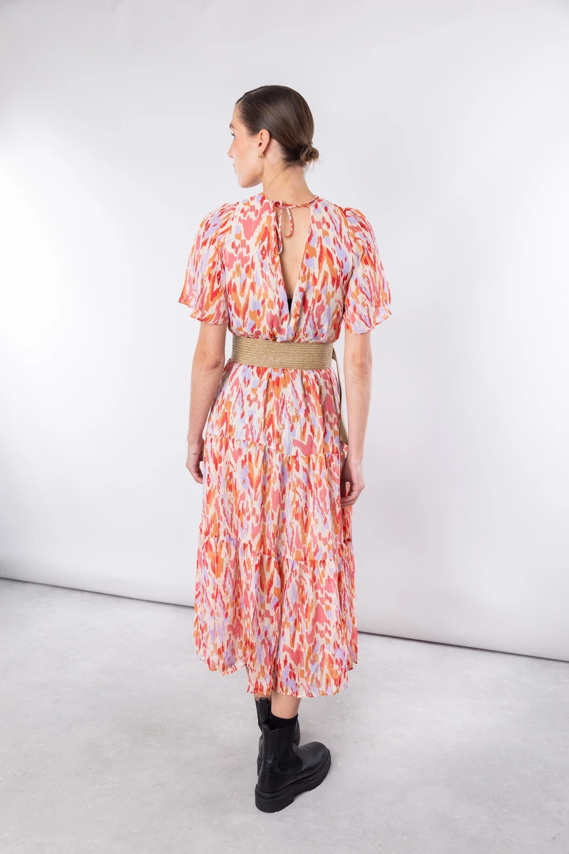 • La coupe Inca est une maxi robe dans un imprimé écru et rose exclusif G&M