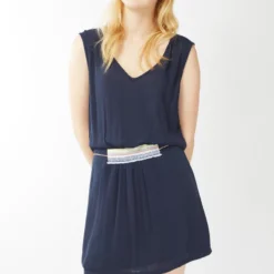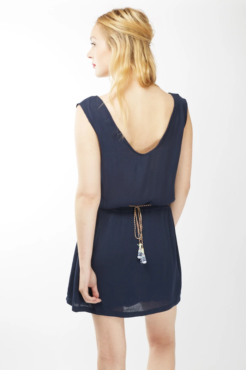 Robe bleue marine, manches courtes et col en V, resserrée à la taille avec une fine ceinture.