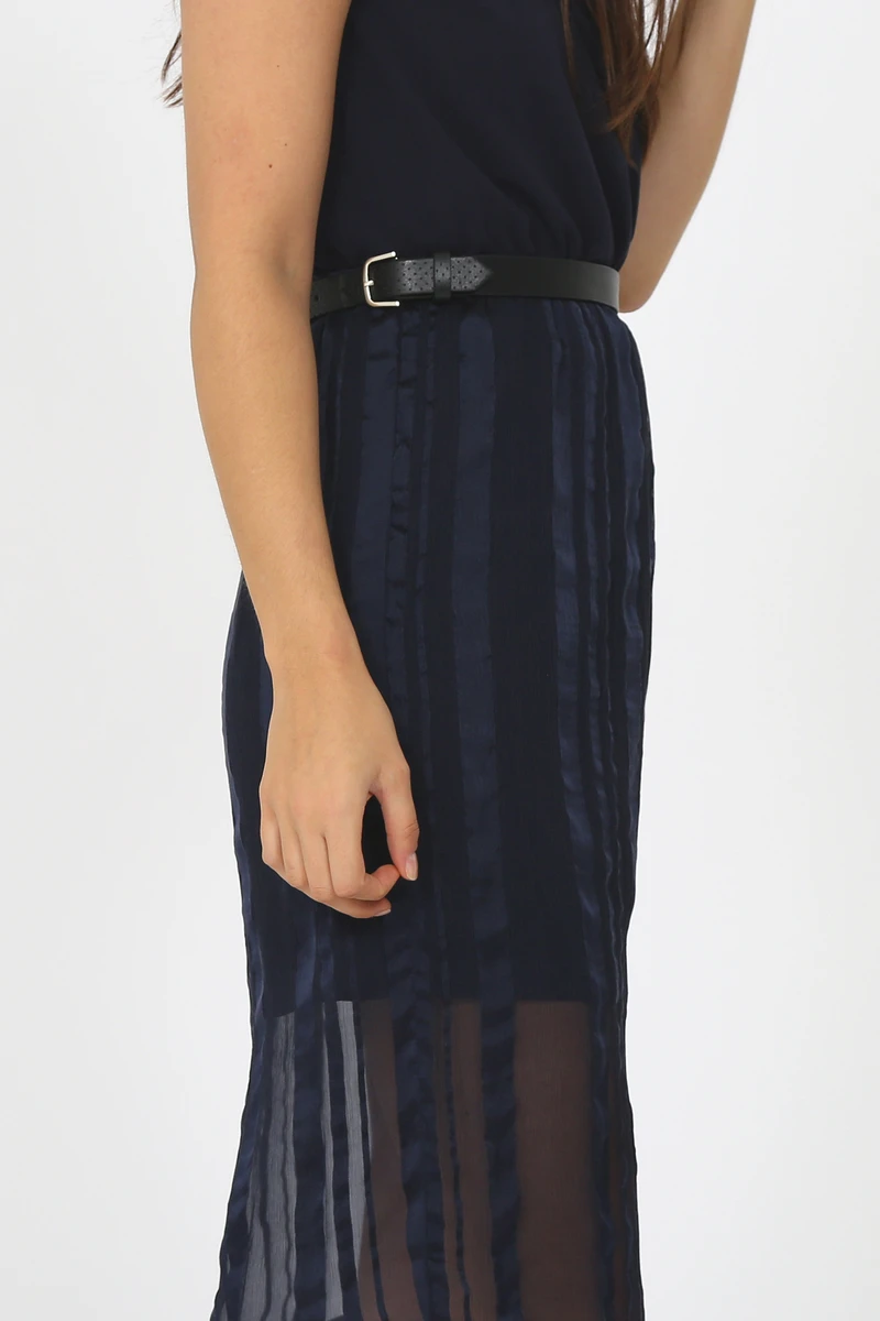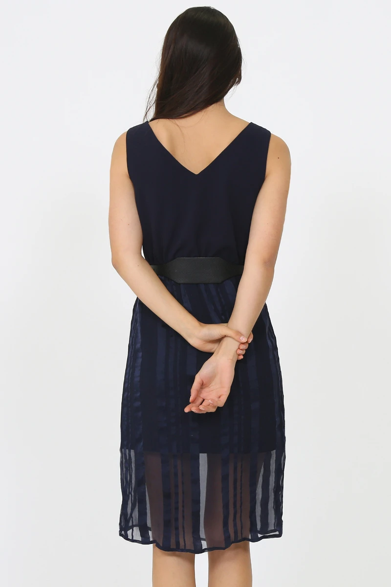 Robe bleue marine, manches courtes et col en V avec effet cache coeur sur le devant. Elastique à la taille et tulle à rayures transparent au niveau de la jupe.