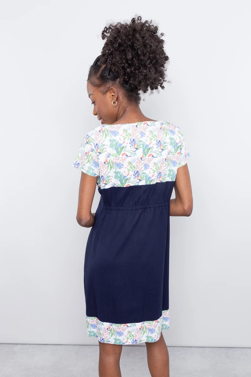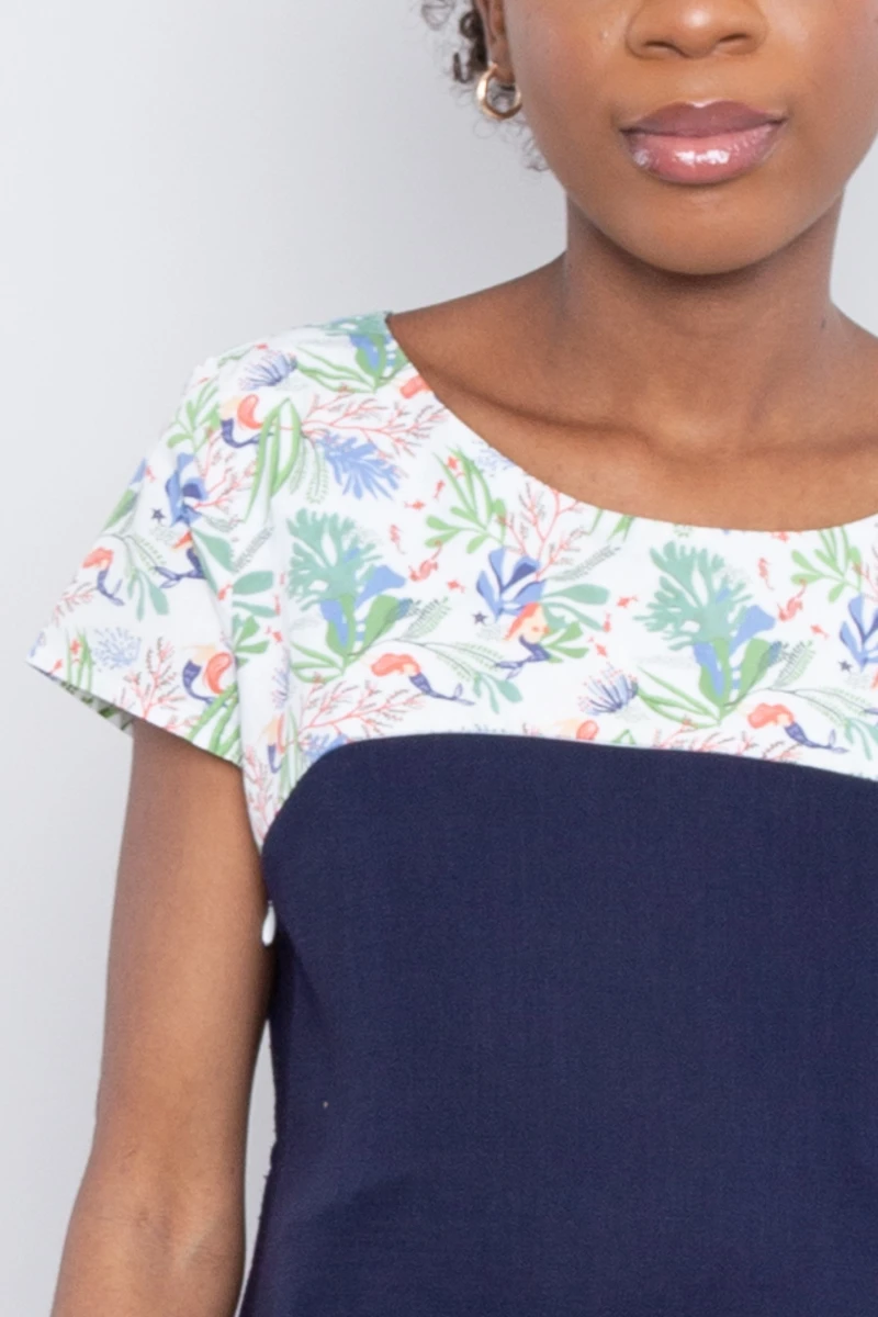 • Forme trapèze à l’allure sixties, avec empiècements contrastés sur les épaules et le bas de la robe motifs marins