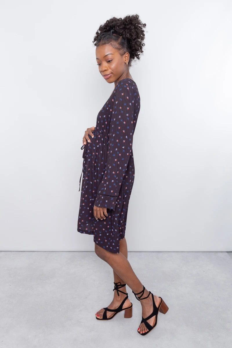 La robe de maternité a des manches flares, ornées de biais ajouré au niveau des poignets.