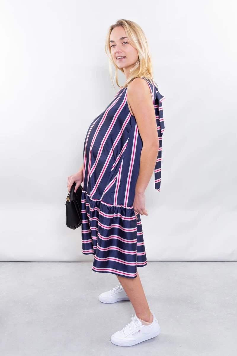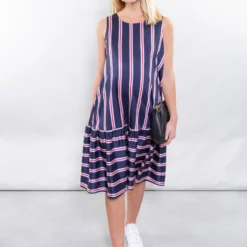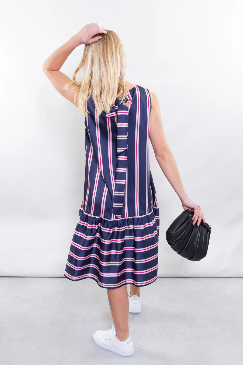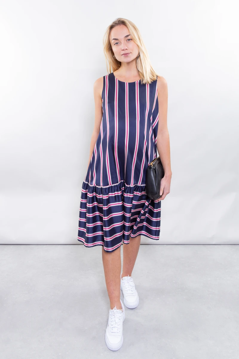 • Jeu de rayures inversées sur le volant au bas de la robe