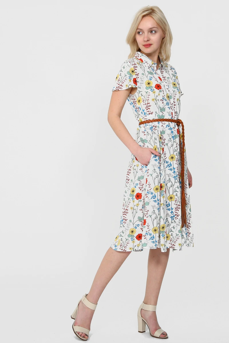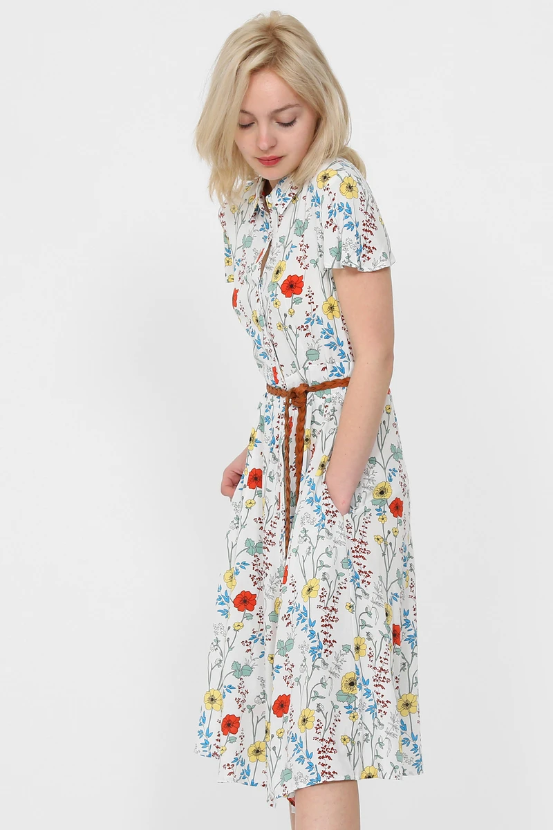 Robe longue blanche avec un imprimé floral et col. Deux poches, manches courtes et boutonnée sur le devant.