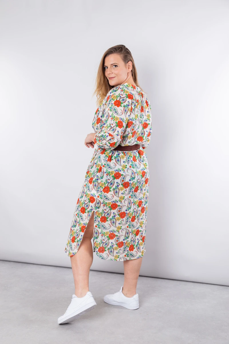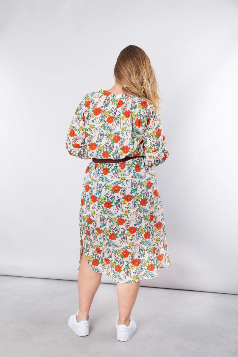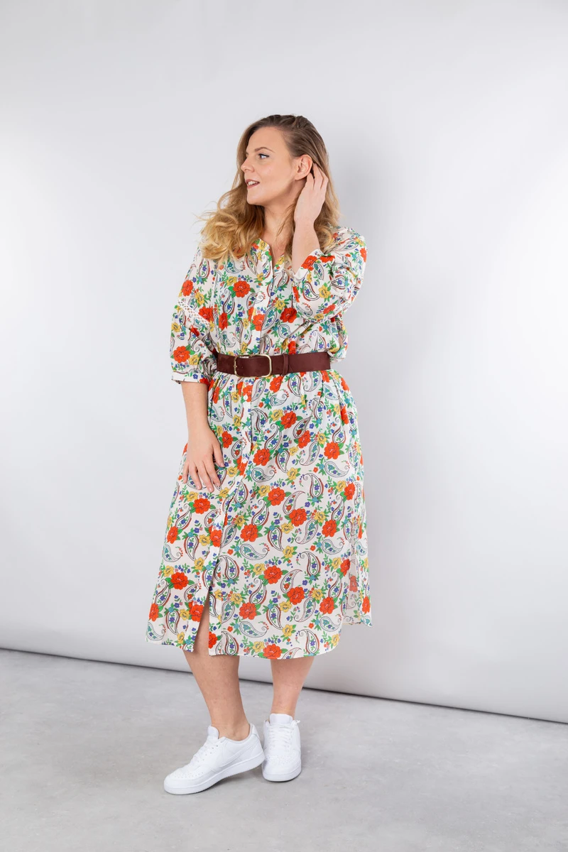 • Robe chemise blanche à imprimés fleuris, un peu transparente n’hésitez pas à ajouter un fond de robe