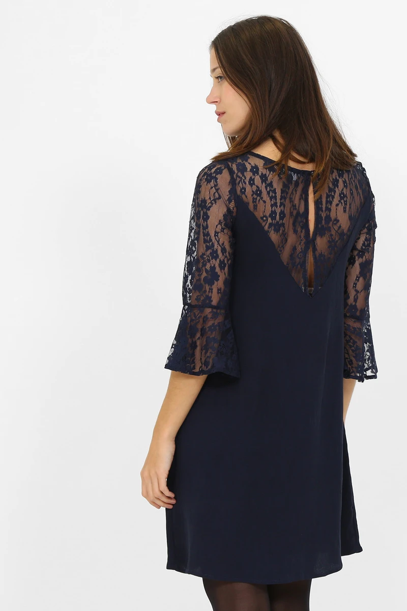 Robe bleue marine, manches 3/4 et col rond avec dentelle sur les épaules, dans le dos et sur les bras.