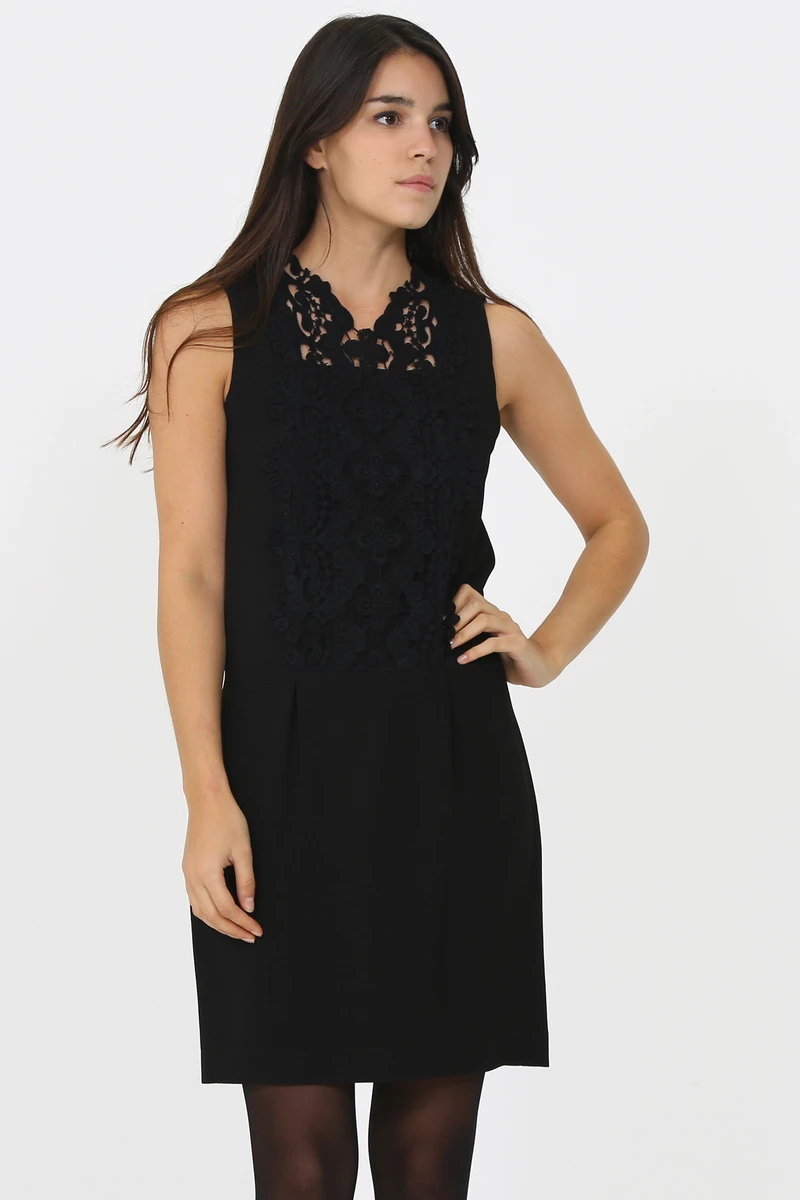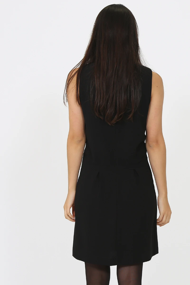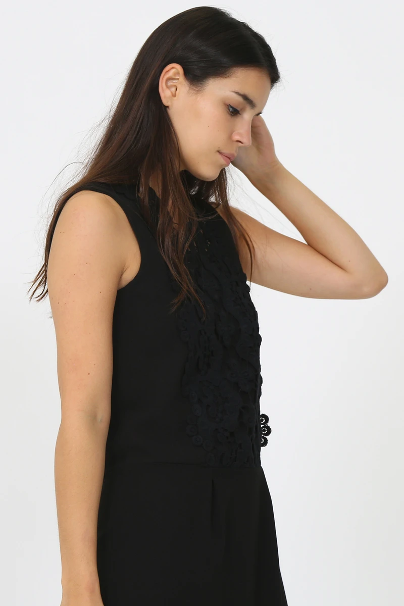 Robe noire sans manches, col rond et zip dans le haut du dos. Détail de broderie noire sur le devant.