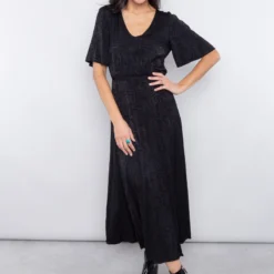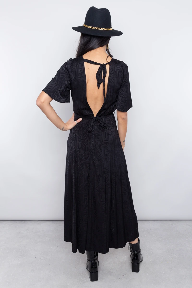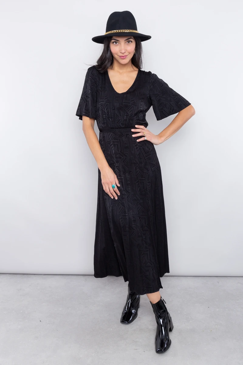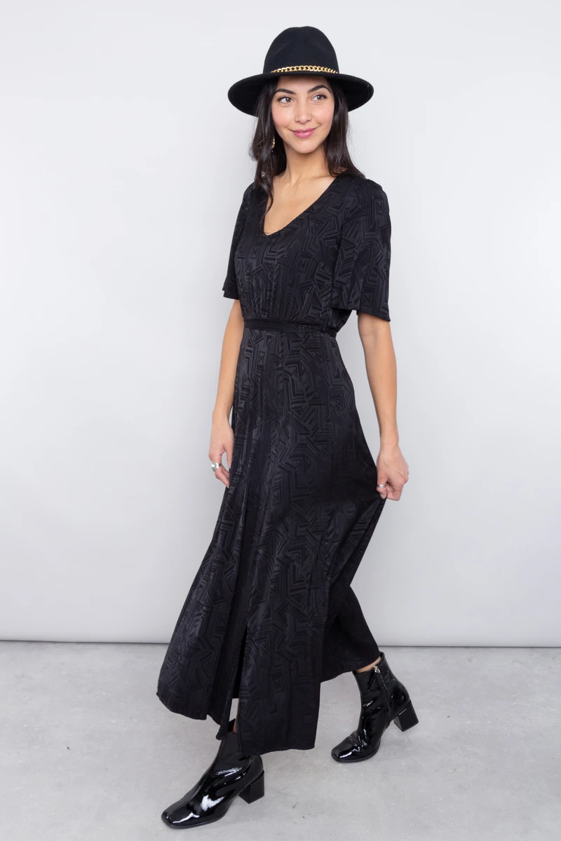 • Robe longue noire à imprimés abstraits incrustés